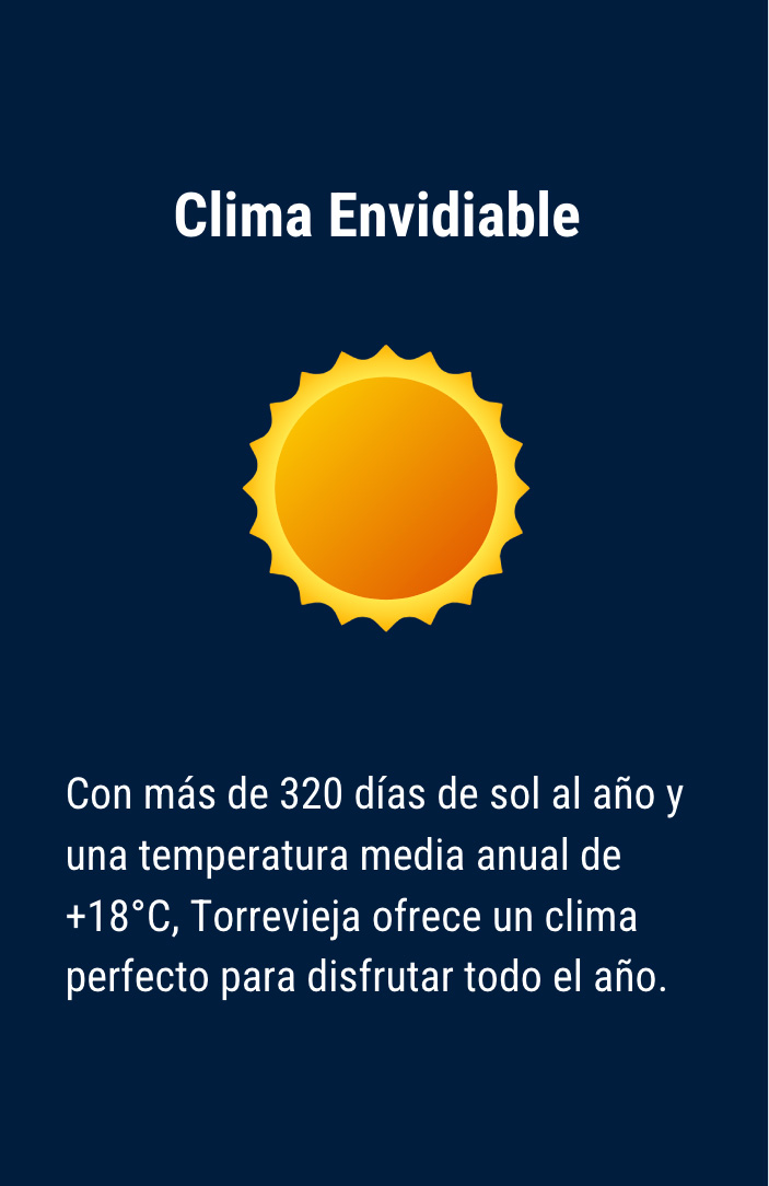 • Clima Envidiable: Más de 320 días de sol al año y una temperatura media anual que supera los 18°C. Olvídate del frío y la lluvia; aquí, cada día es una invitación a disfrutar del aire libre.
