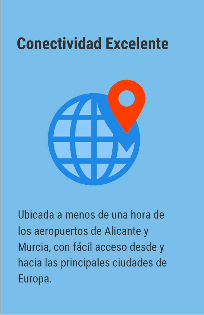 • Conectividad Excelente: A menos de una hora de los aeropuertos de Alicante (El Altet) y Murcia (Corvera), Torrevieja está perfectamente conectada con el resto de Europa, facilitando tus viajes y los de tus seres queridos.