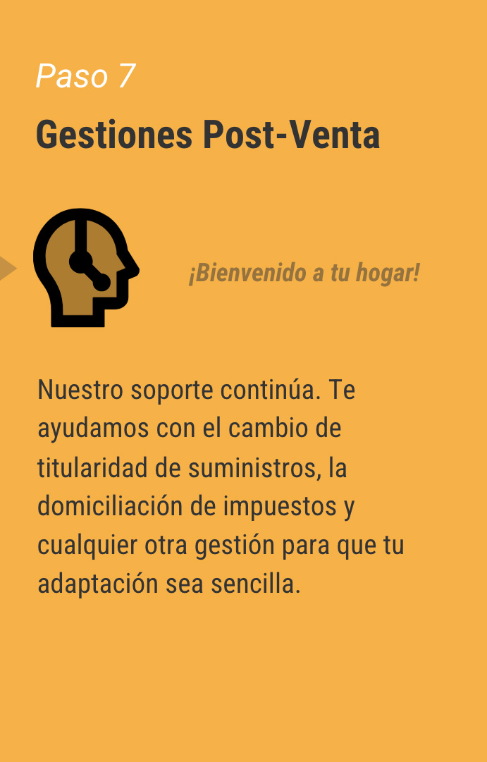 8. Gestiones Post-Venta: Nuestro soporte continúa. Te ayudamos con el cambio de titularidad de suministros, la domiciliación de impuestos y cualquier otra gestión necesaria para que tu adaptación sea lo más sencilla posible.
