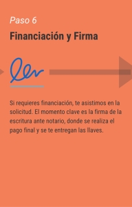 6. Financiación (si es necesario): Si requieres financiación, te asistimos en la solicitud de hipoteca con las entidades bancarias.