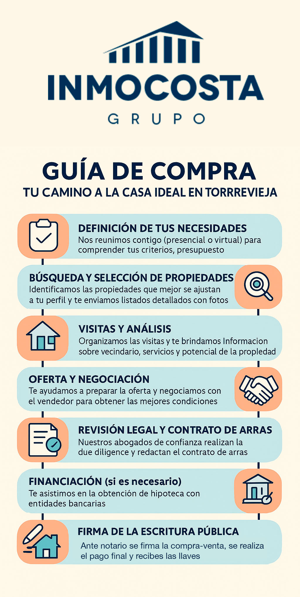 Entendemos que el camino para comprar casa en Torrevieja puede parecer complejo, pero con InmoCosta a tu lado, se convierte en un proceso claro y emocionante. Aquí te detallamos las fases principales: