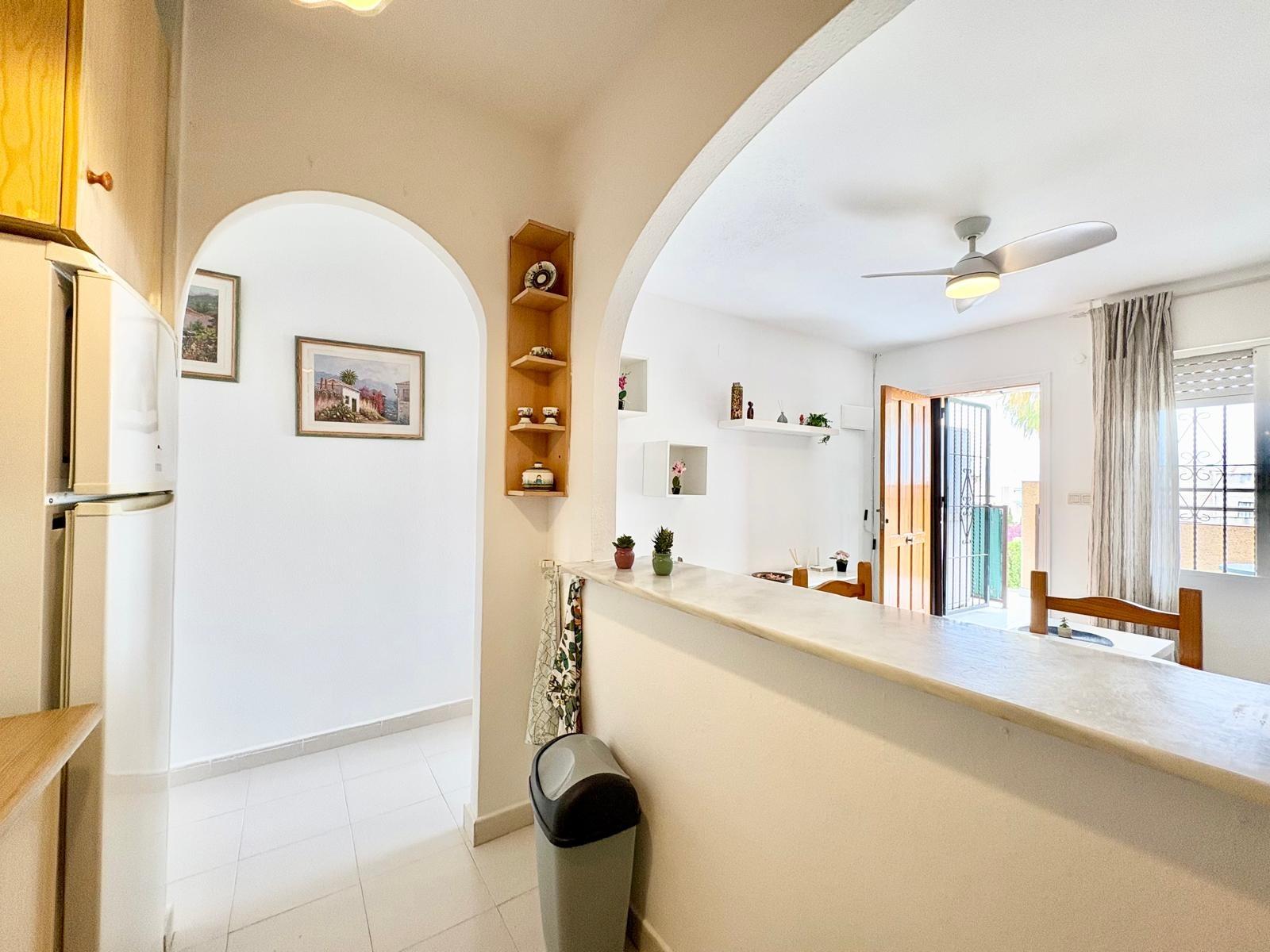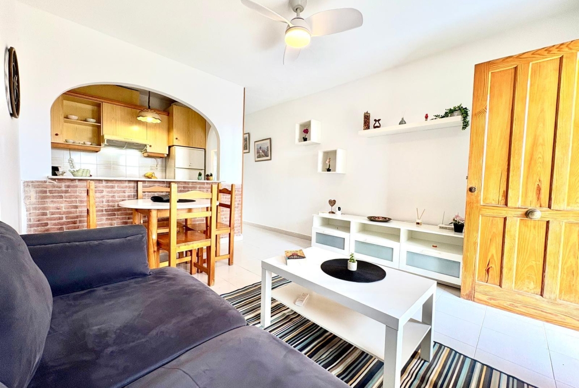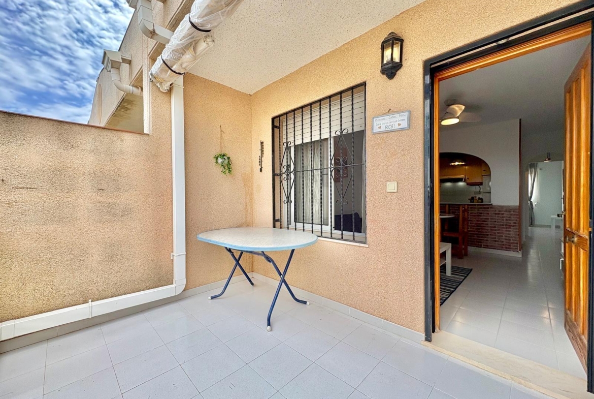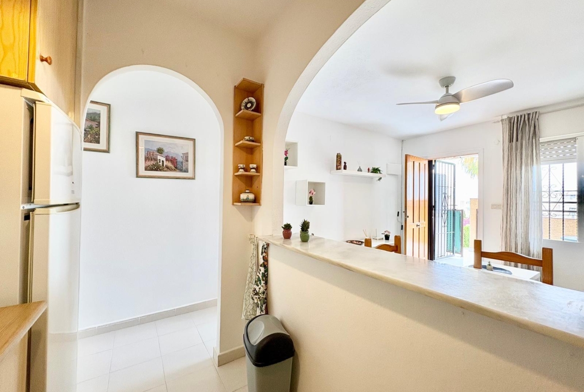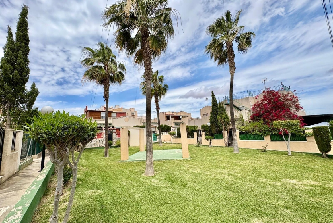 Charming top-floor bungalow in Lago Jardín II – ready to enjoy from day one. Located in a quiet residential area on the coast, this cozy first-floor bungalow is ideal both as a second home and as a holiday rental investment. The property features a spacious double bedroom with a built-in wardrobe, a full bathroom with a bathtub, an open-plan kitchen, a living-dining room, and a pleasant terrace with unobstructed views of the communal gardens. It enjoys excellent orientation: the terrace faces northeast and the bedroom faces southwest, ensuring natural light throughout the day. The area offers a peaceful setting surrounded by nature, yet with all amenities within easy reach: bars, a bus stop, a supermarket, a pharmacy, and the magnificent beaches of Torrevieja just 3 km away. Communal pool (please inquire). A perfect opportunity for those seeking tranquility without sacrificing comfort. Are you going to miss out?