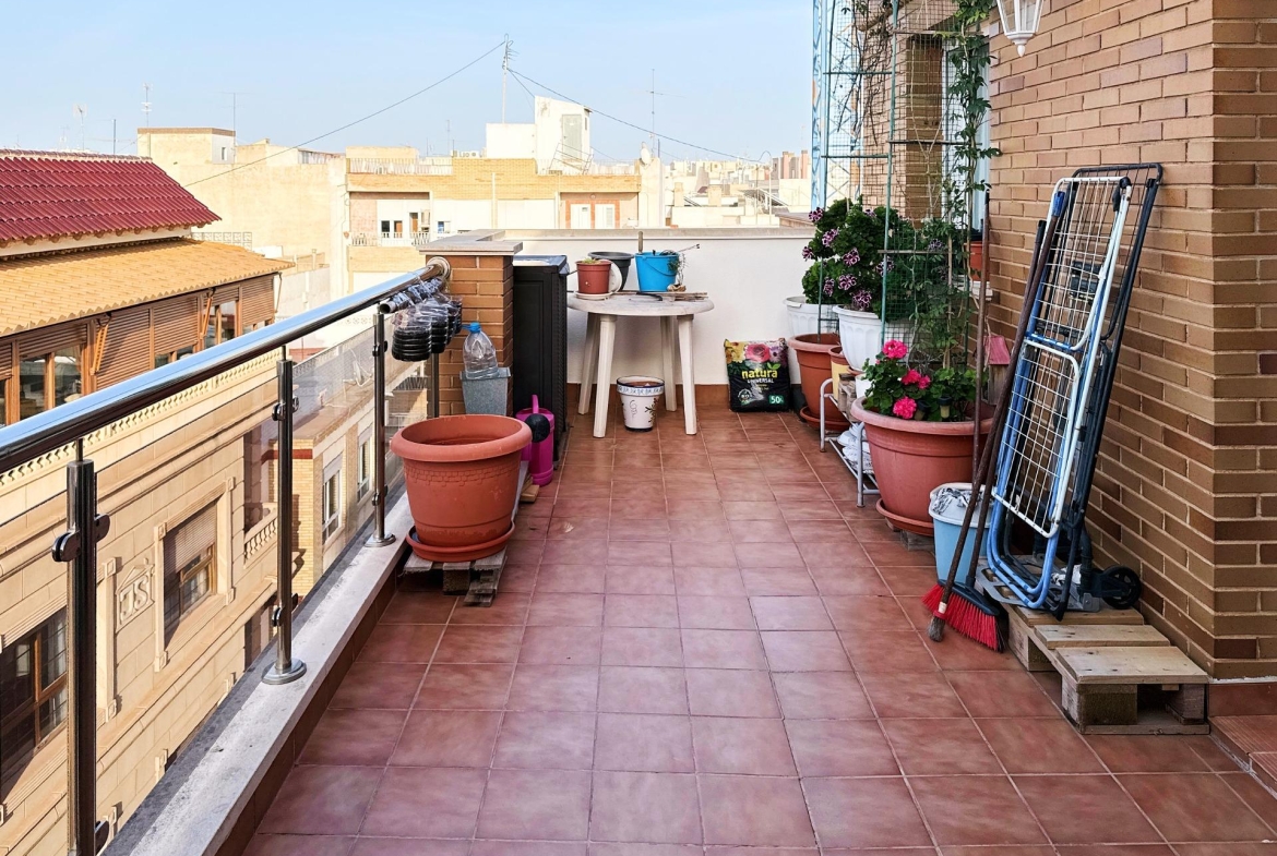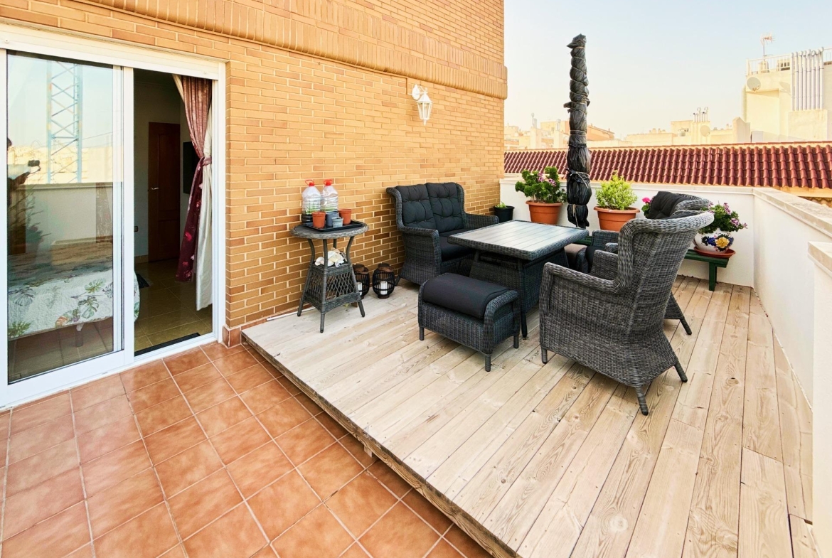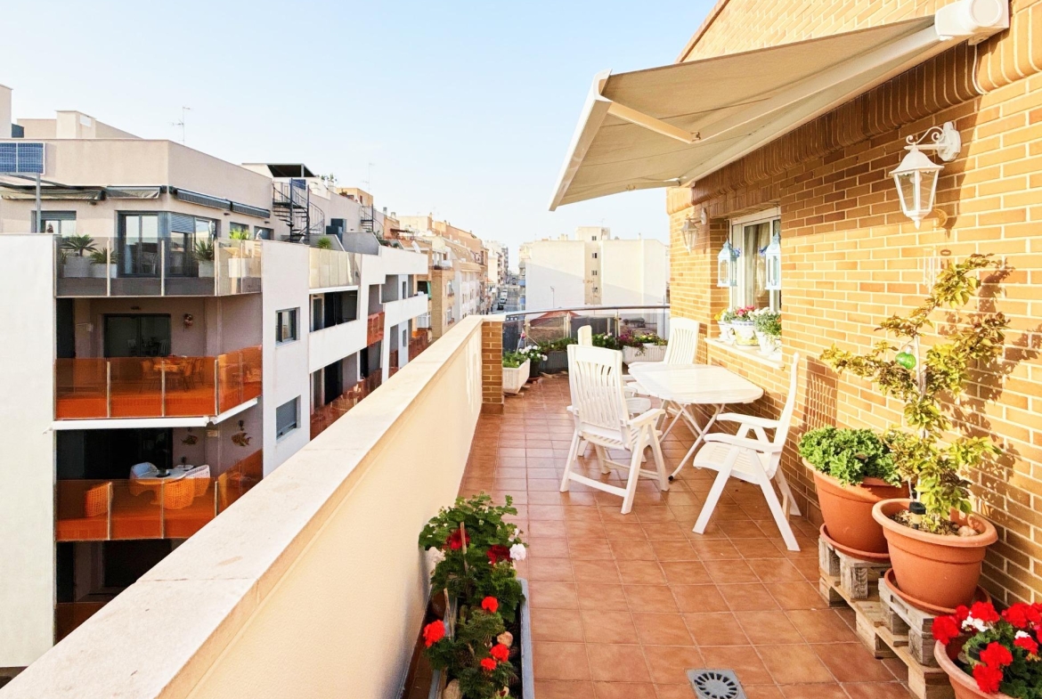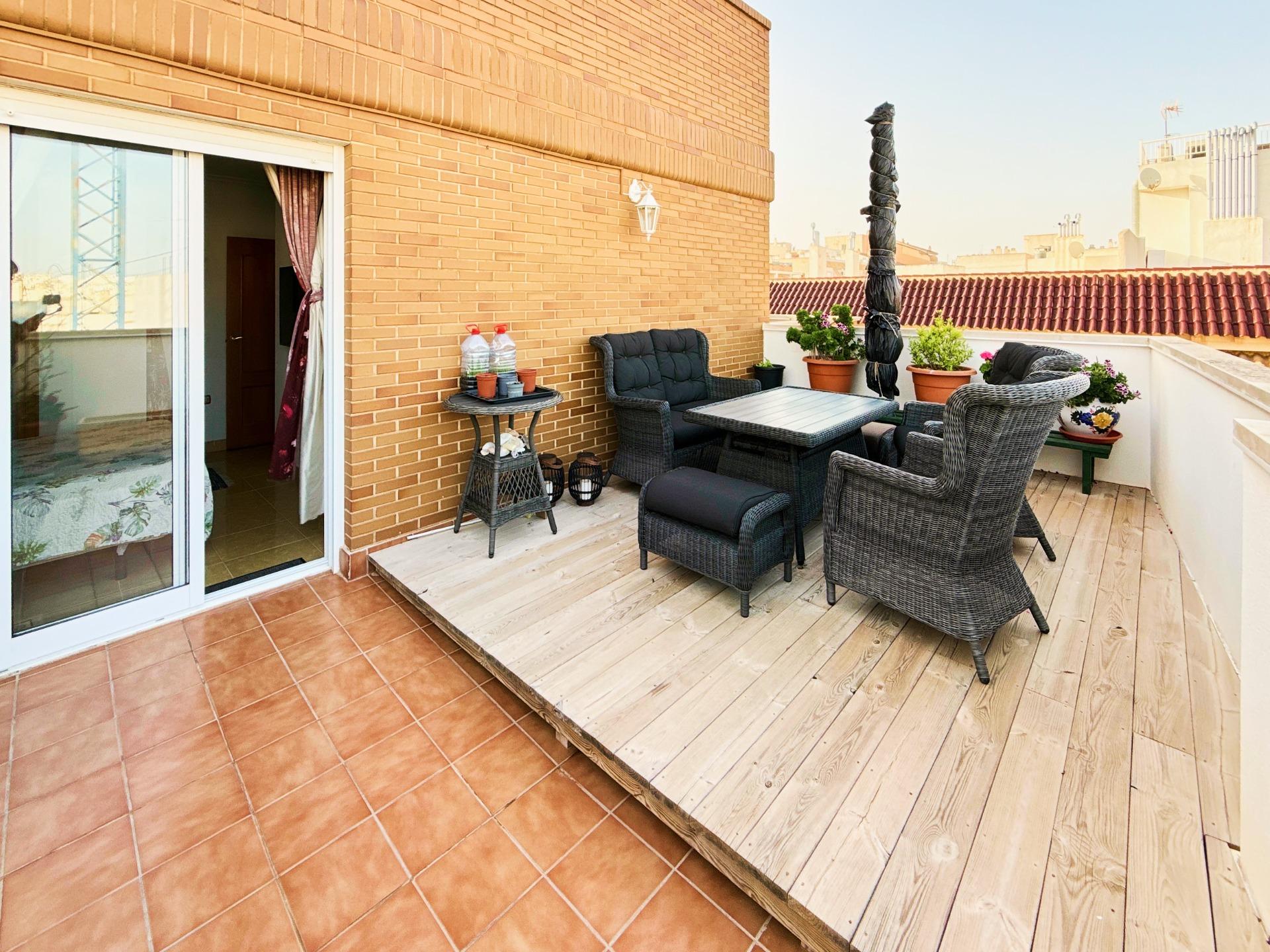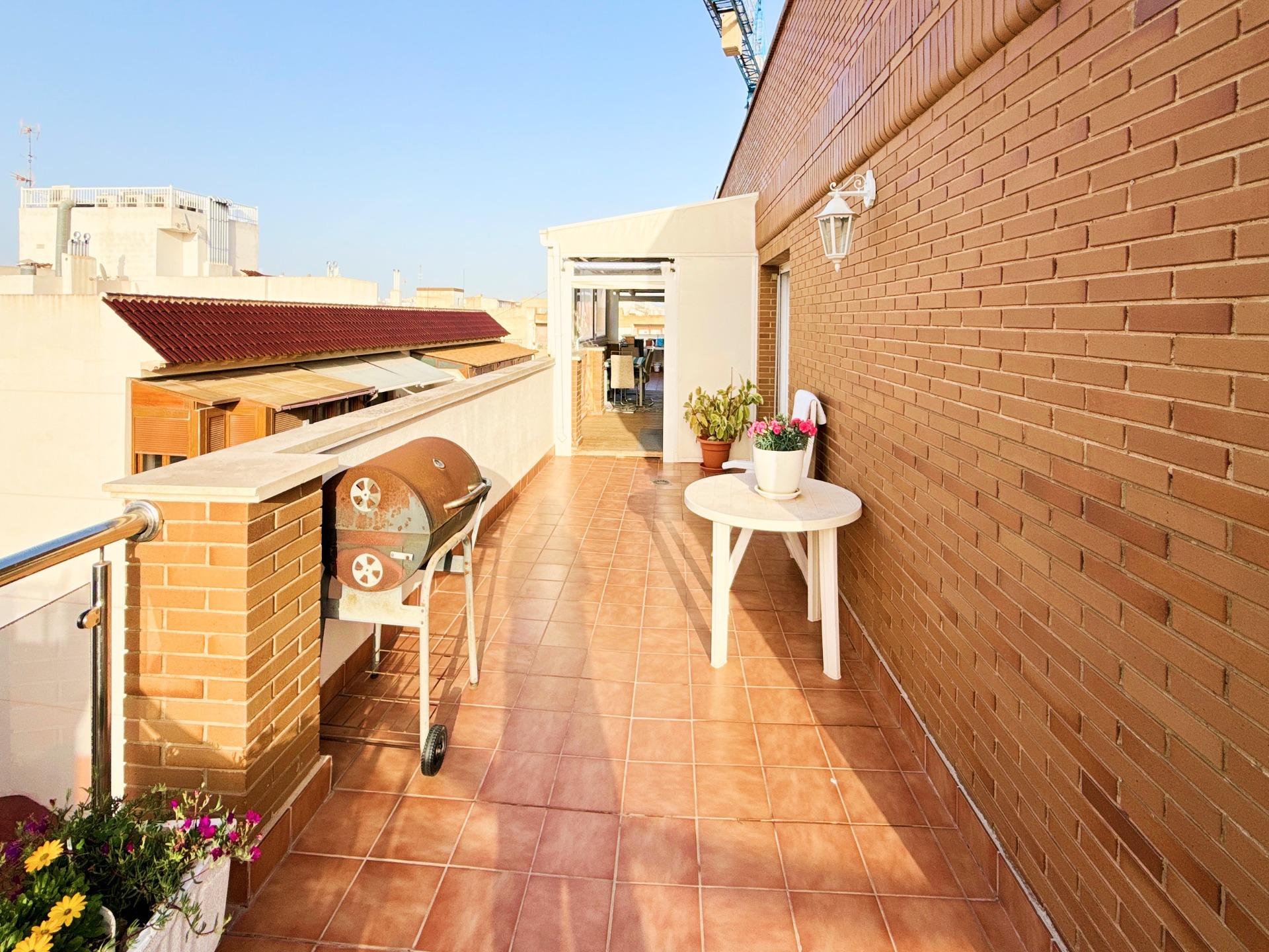 Os presentamos esta maravilla de Ático en la zona centro de Torrevieja.~~La vivienda es un ático compuesto de 4 habitaciones y 2 baños (uno de ellos en suite para la habitación principal). ~Sus dos terrazas nos brindan la oportunidad de relajarte en varios lugares, disfrutando de múltiples orientaciones y poder aprovechar todos los momentos de sol y de sombra según el momento del día.~2 de las habitaciones están conectadas directamente con la terraza principal que rodea en forma de L la vivienda y 1 de habitación tiene su propia terraza de unos 15 metros cuadrados.~Igualmente, en la terraza principal, hay un espacio con una pérgola para poder disfrutar de una buena comida con familiares y amigos, un buen momento de relajación y poder aprovechar los más de 300 días de sol que nos regala el envidiable clima de Torrevieja.~~Además, tiene una cocina independiente completamente equipada tiene igualmente acceso a la terraza y a la parte de la terraza que está cubierta y acristalada, que está estratégicamente ubicada a la salida de la cocina.~~En esta casa nos encontraremos acabados de gran calidad y luminosidad durante todos los momentos del día.~~En el precio viene incluido una plaza de garaje y un trastero en un edificio a 100m para que te olvides de buscar aparcamiento en la zona.~La céntrica ubicación del ático nos permite tener todos los servicios a escasos minutos andando. La plaza de la Constitución esta a 3 minutos andando y el Paseo de Vista Alegre con el puerto a 7 minutos andando (500m).~~Ven YA a visitar esta propiedad exclusiva y quédate sin palabras!!