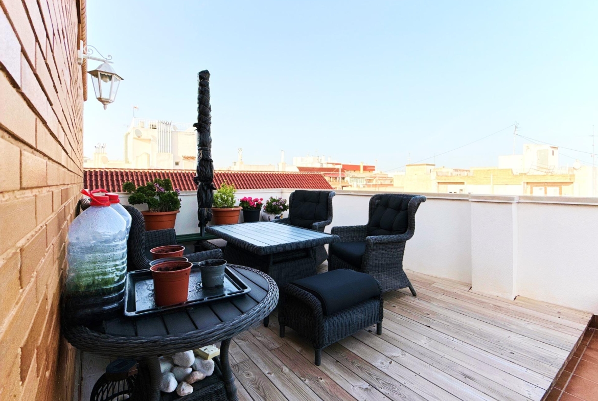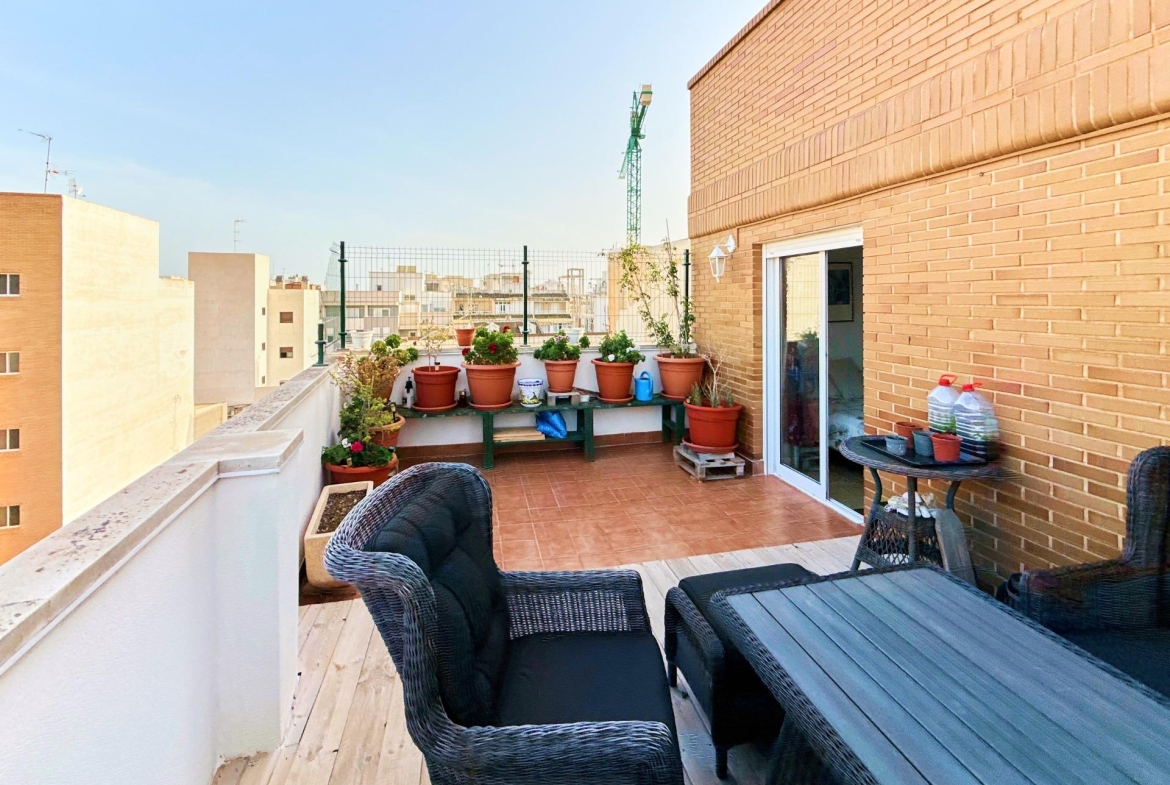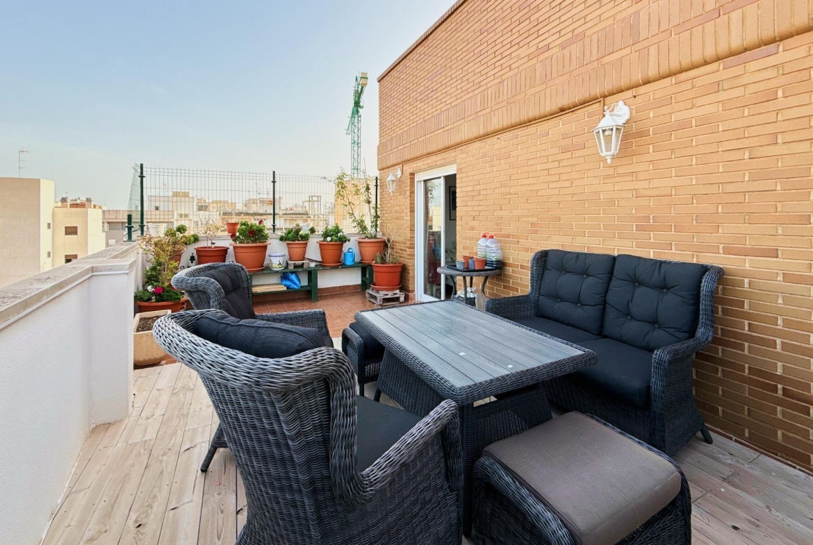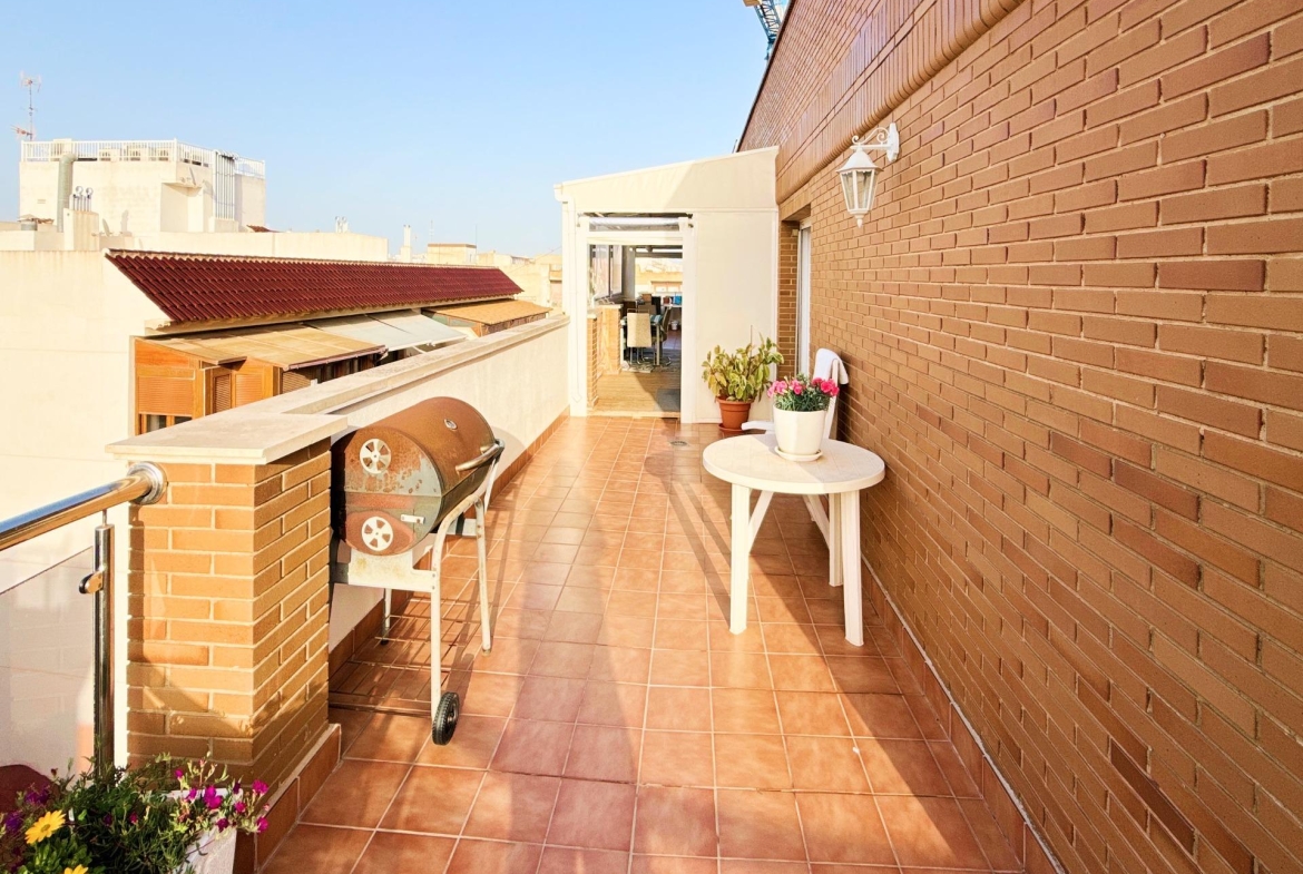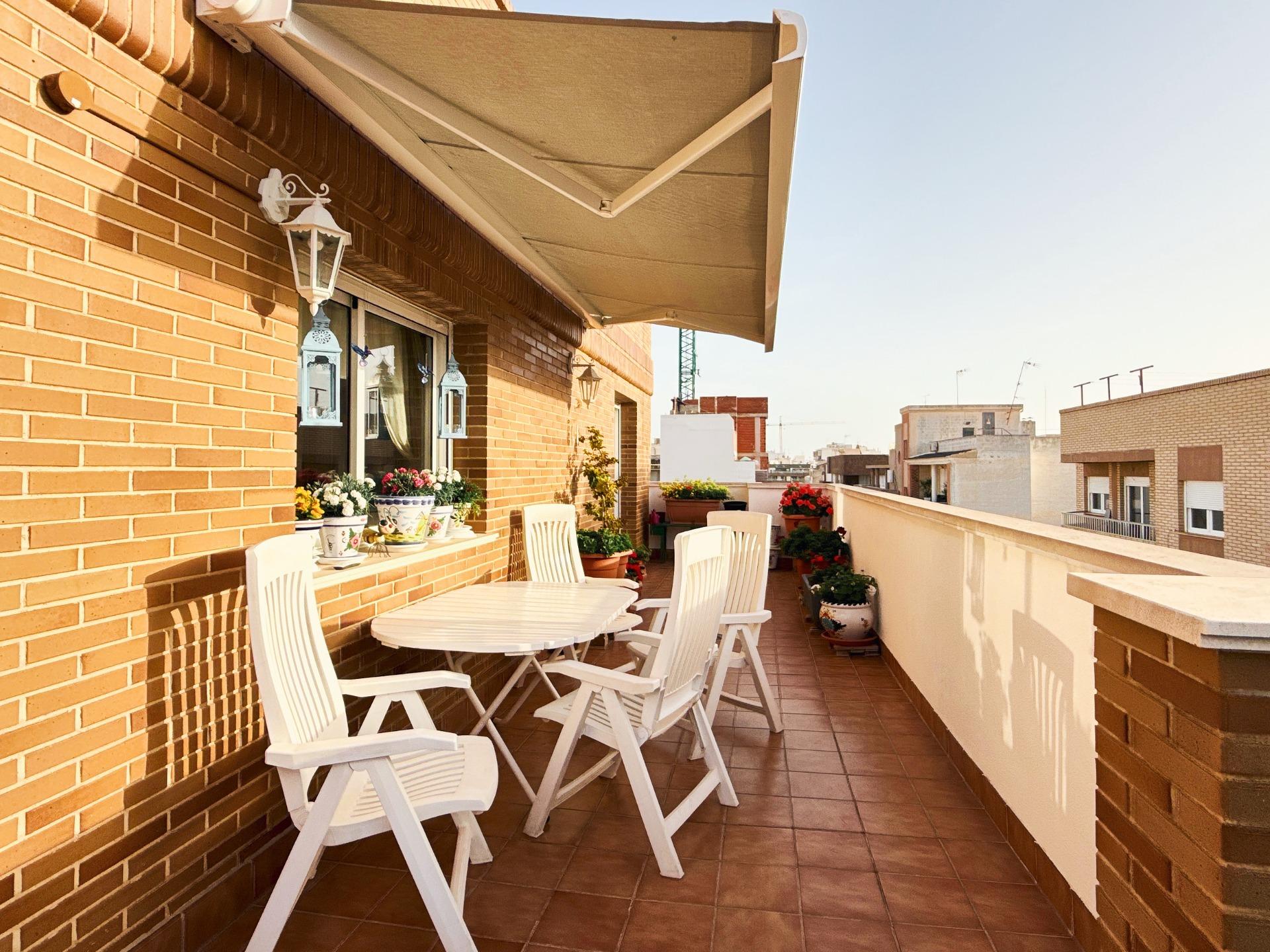 Os presentamos esta maravilla de Ático en la zona centro de Torrevieja.~~La vivienda es un ático compuesto de 4 habitaciones y 2 baños (uno de ellos en suite para la habitación principal). ~Sus dos terrazas nos brindan la oportunidad de relajarte en varios lugares, disfrutando de múltiples orientaciones y poder aprovechar todos los momentos de sol y de sombra según el momento del día.~2 de las habitaciones están conectadas directamente con la terraza principal que rodea en forma de L la vivienda y 1 de habitación tiene su propia terraza de unos 15 metros cuadrados.~Igualmente, en la terraza principal, hay un espacio con una pérgola para poder disfrutar de una buena comida con familiares y amigos, un buen momento de relajación y poder aprovechar los más de 300 días de sol que nos regala el envidiable clima de Torrevieja.~~Además, tiene una cocina independiente completamente equipada tiene igualmente acceso a la terraza y a la parte de la terraza que está cubierta y acristalada, que está estratégicamente ubicada a la salida de la cocina.~~En esta casa nos encontraremos acabados de gran calidad y luminosidad durante todos los momentos del día.~~En el precio viene incluido una plaza de garaje y un trastero en un edificio a 100m para que te olvides de buscar aparcamiento en la zona.~La céntrica ubicación del ático nos permite tener todos los servicios a escasos minutos andando. La plaza de la Constitución esta a 3 minutos andando y el Paseo de Vista Alegre con el puerto a 7 minutos andando (500m).~~Ven YA a visitar esta propiedad exclusiva y quédate sin palabras!!